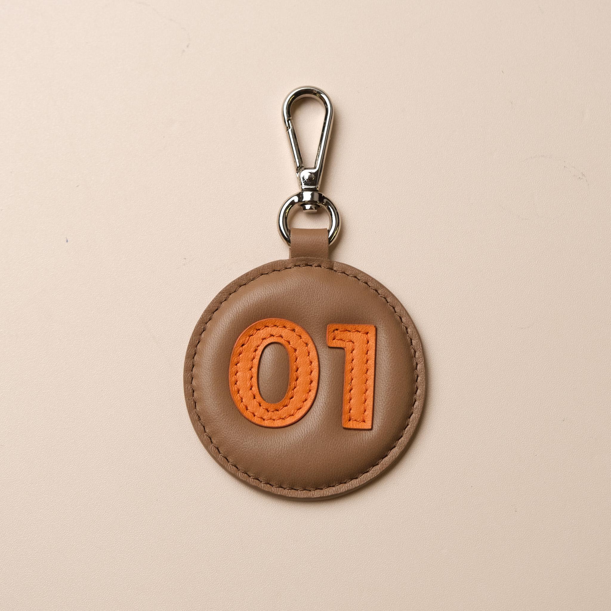 Tag da bò thuộc số 01 được chế tác thủ công từ da bò Swift cao cấp màu Etoup – tông nâu xám trầm thanh lịch. Mặt trước nổi bật với hai chữ số “01” bằng da cam appliqué, khâu viền tỉ mỉ tạo chiều sâu và điểm nhấn màu sắc ấn tượng. Mặt sau dập chìm logo Destination Rally cùng biểu tượng la bàn, thể hiện tinh thần phiêu lưu và cá tính riêng.