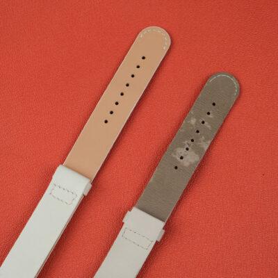 Dây da đồng hồ handmade được chế tác từ da bò vân Swift cao cấp màu trắng ngà – loại da nổi tiếng với bề mặt trơn mịn, mềm dẻo và độ bóng nhẹ tự nhiên. Sản phẩm được nghệ nhân KOI Leather cắt may hoàn toàn bằng tay, đường chỉ khâu đều tay và chắc chắn, mang đến vẻ thanh lịch tối giản khi kết hợp cùng mặt đồng hồ. Khóa cài bằng thép không gỉ sáng bóng, tương thích tốt với các dòng đồng hồ Tissot và nhiều thương hiệu có kích thước lug tương đương. Dây có lỗ cài đa vị trí, phù hợp nhiều cỡ cổ tay. Màu trắng ngà dễ phối đồ, thích hợp cho cả nam và nữ trong phong cách thanh lịch, hiện đại.
