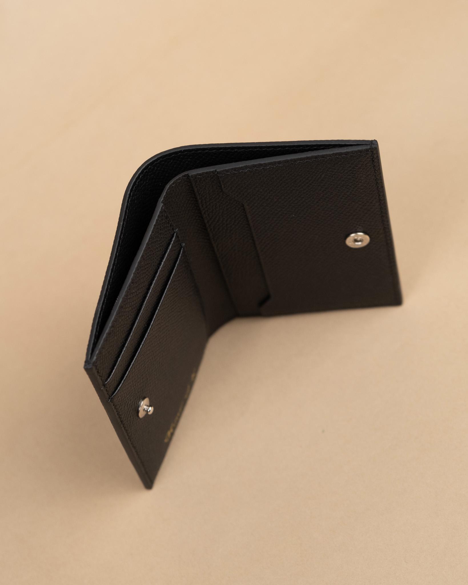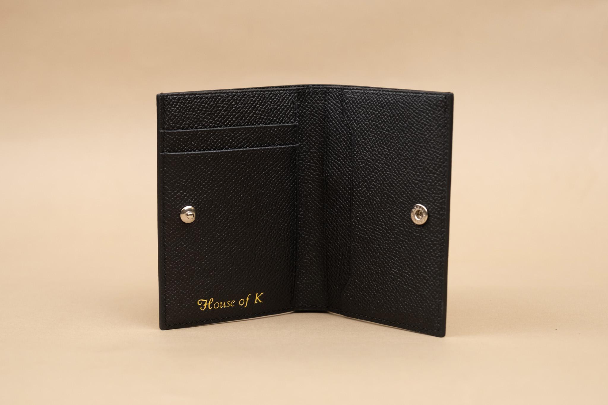 Thiết kế dạng gập đứng (vertical bifold) nhỏ gọn, bên trong bố trí nhiều ngăn thẻ, ngăn phẳng đựng giấy tờ và khóa bấm snap kim loại bạc giữ ví chắc chắn. Mỗi đường may, cạnh da đều được nghệ nhân xử lý tỉ mỉ hoàn toàn bằng tay, đảm bảo độ bền vượt trội theo thời gian. Dấu ấn “House of K” dập chìm mạ vàng bên trong khẳng định xuất xứ thủ công chính hãng.