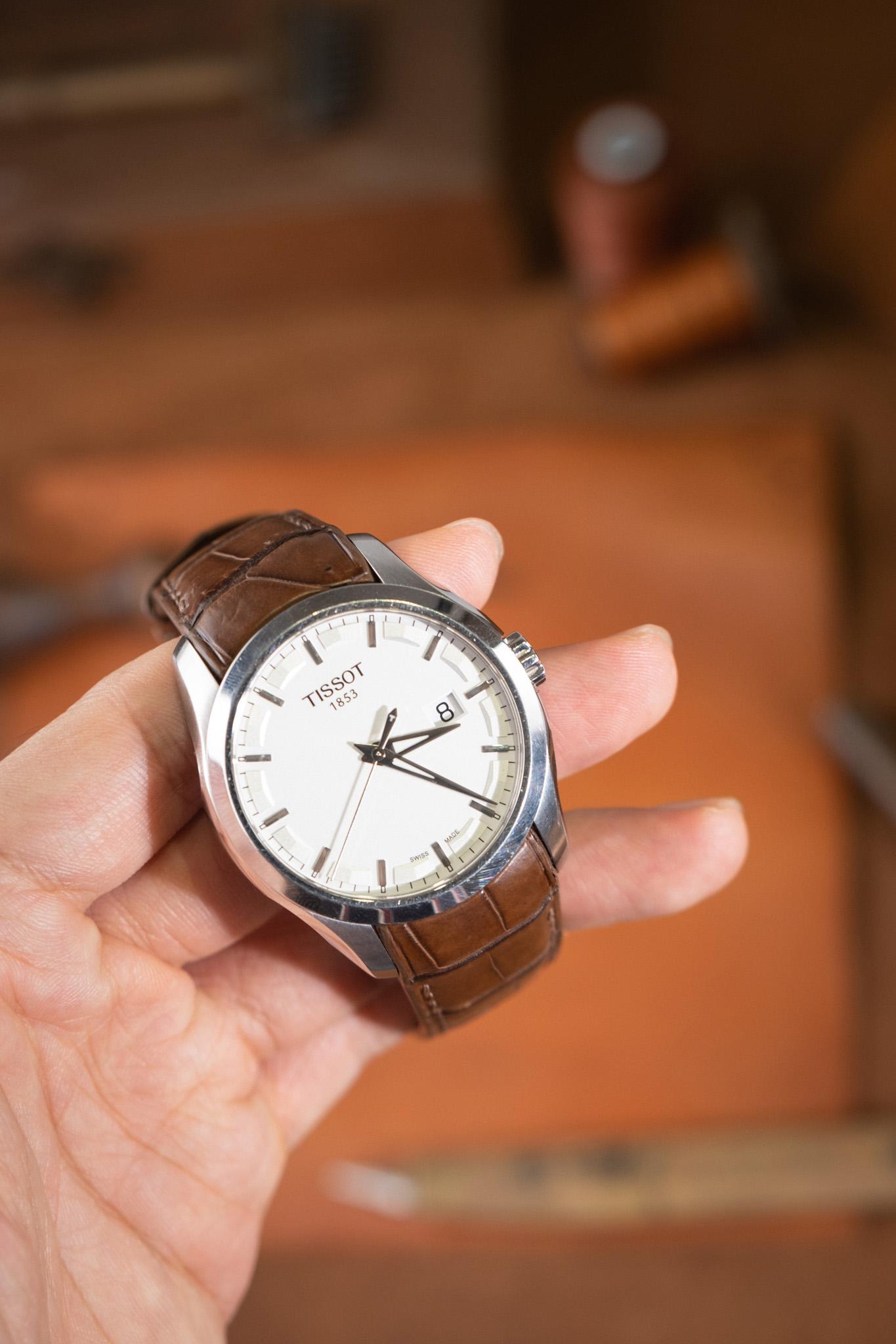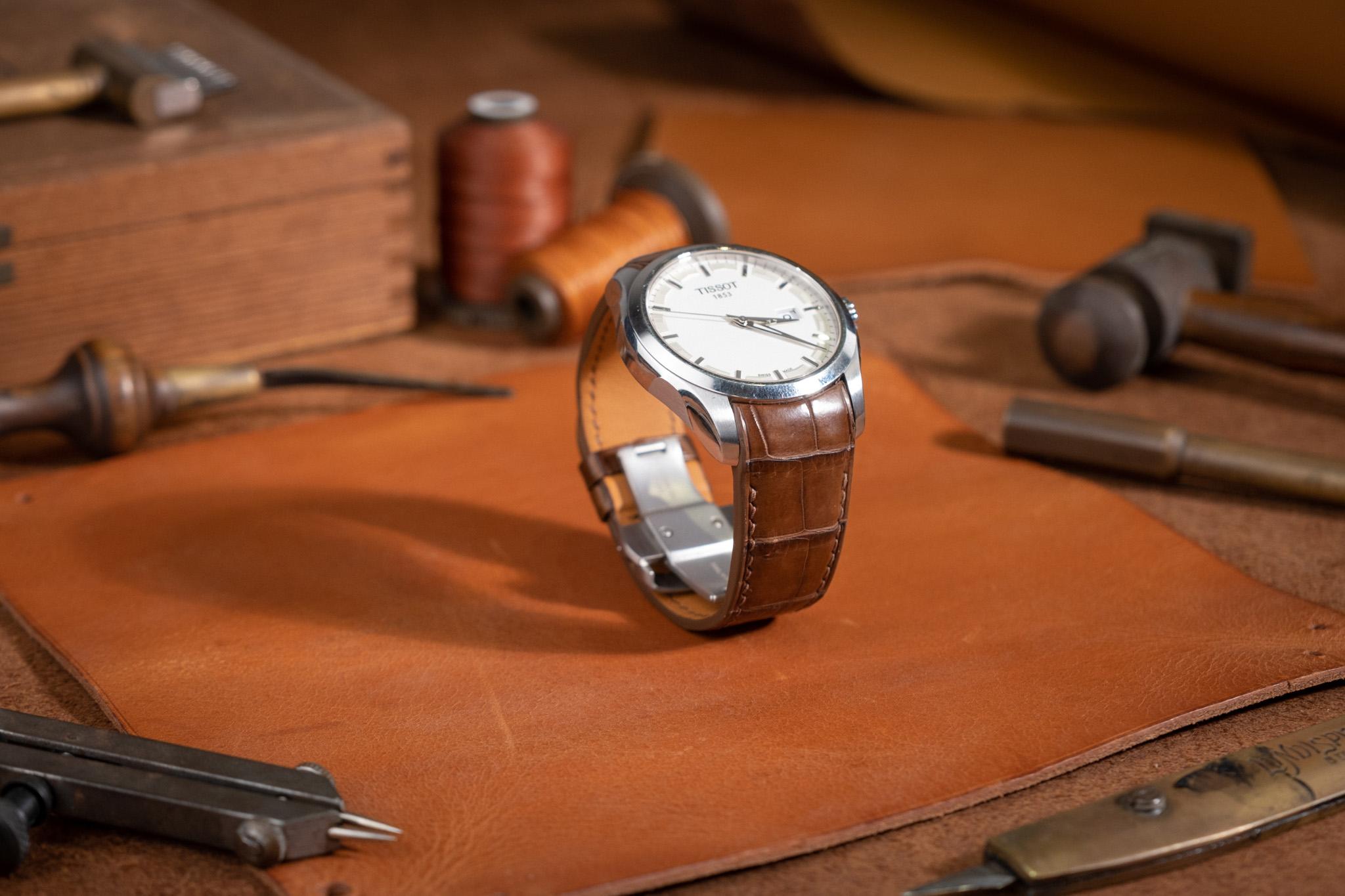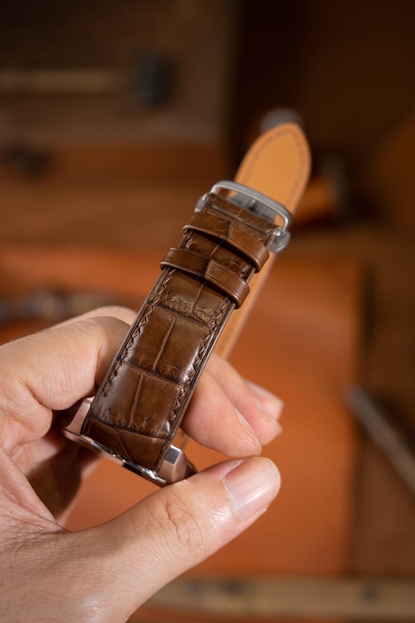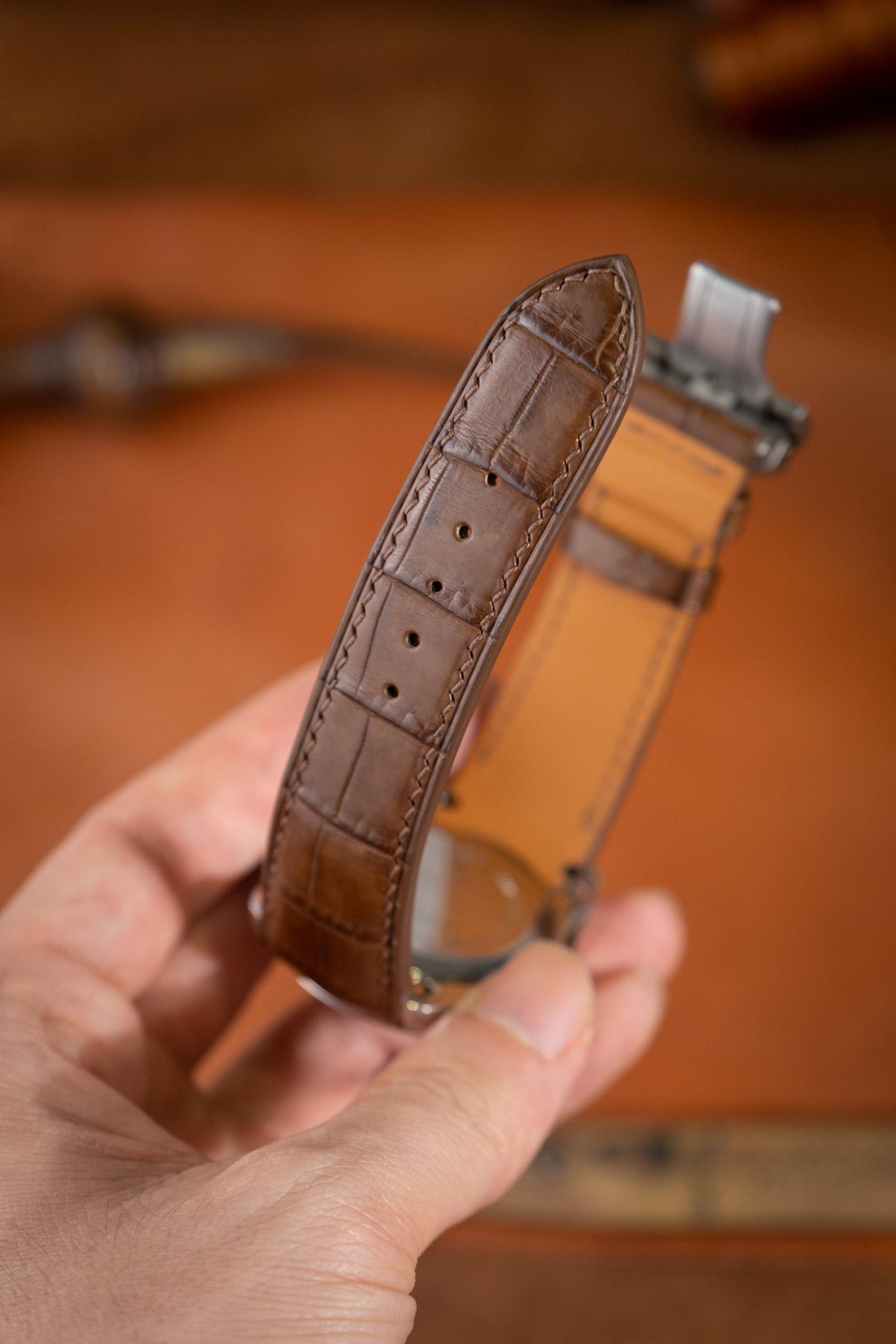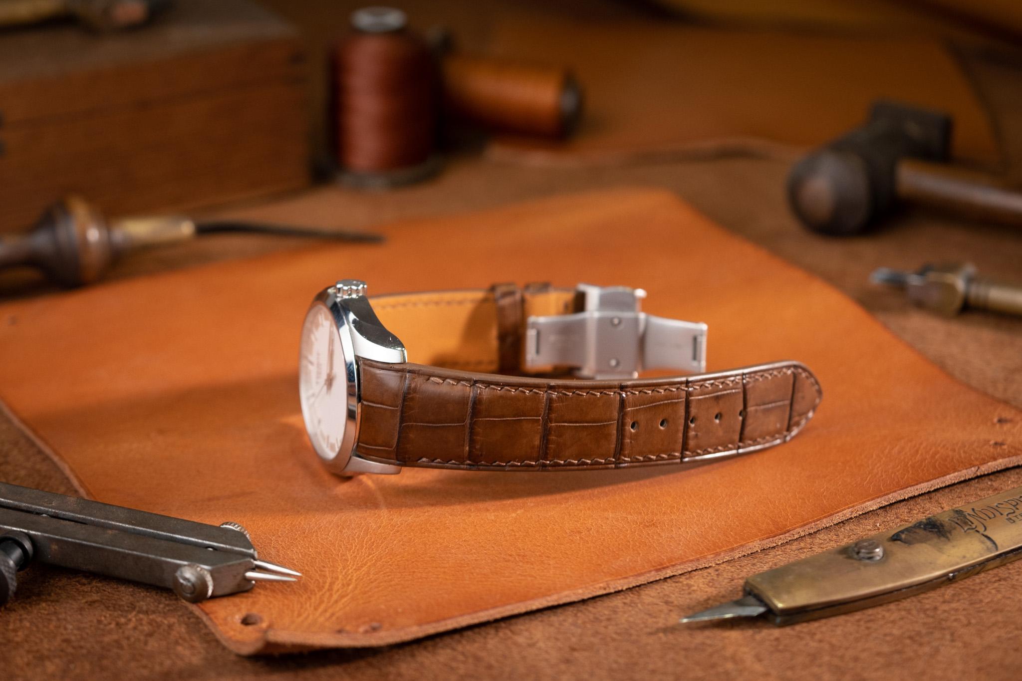 Dây da đồng hồ thủ công từ da cá sấu thật vân bụng, màu nâu cognac sang trọng. Khâu tay tỉ mỉ, lót da bò mềm mại, tương thích khóa bấm deployant.