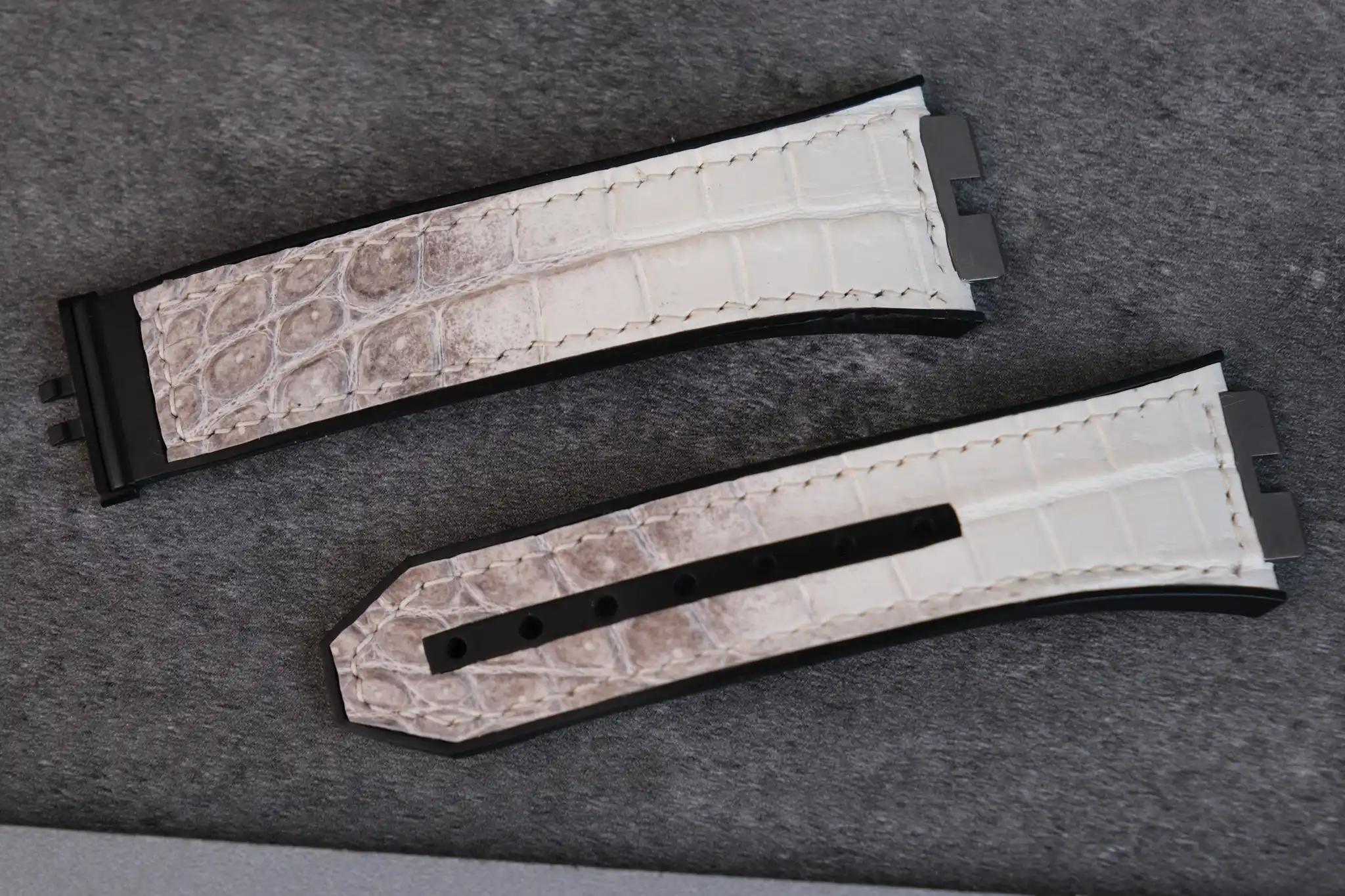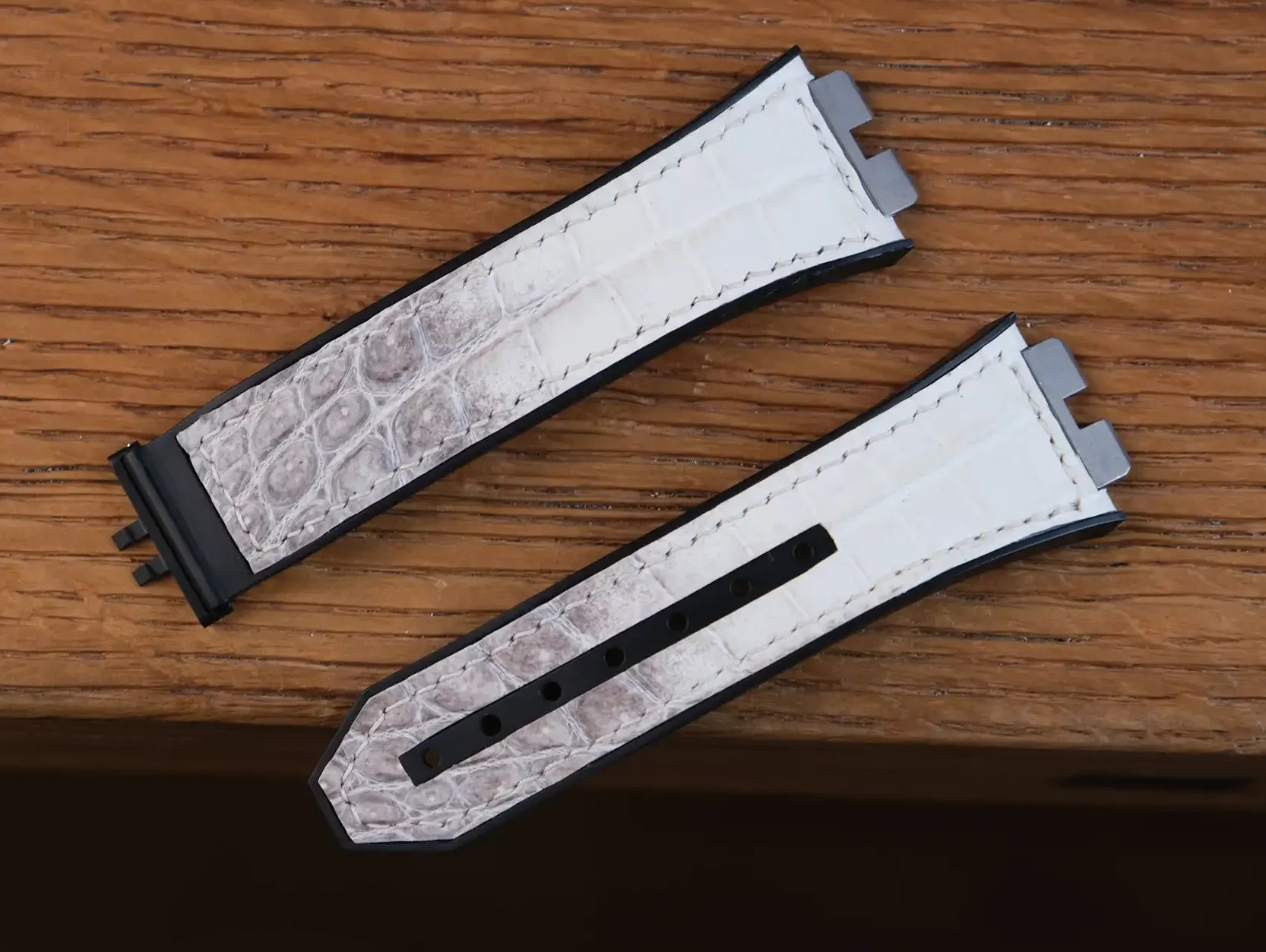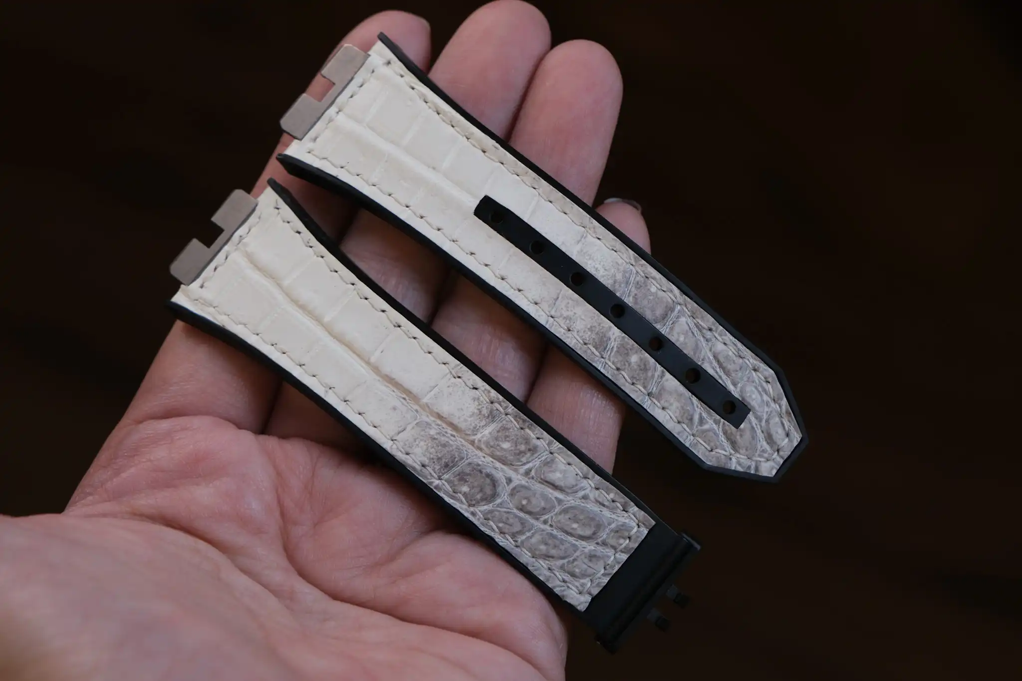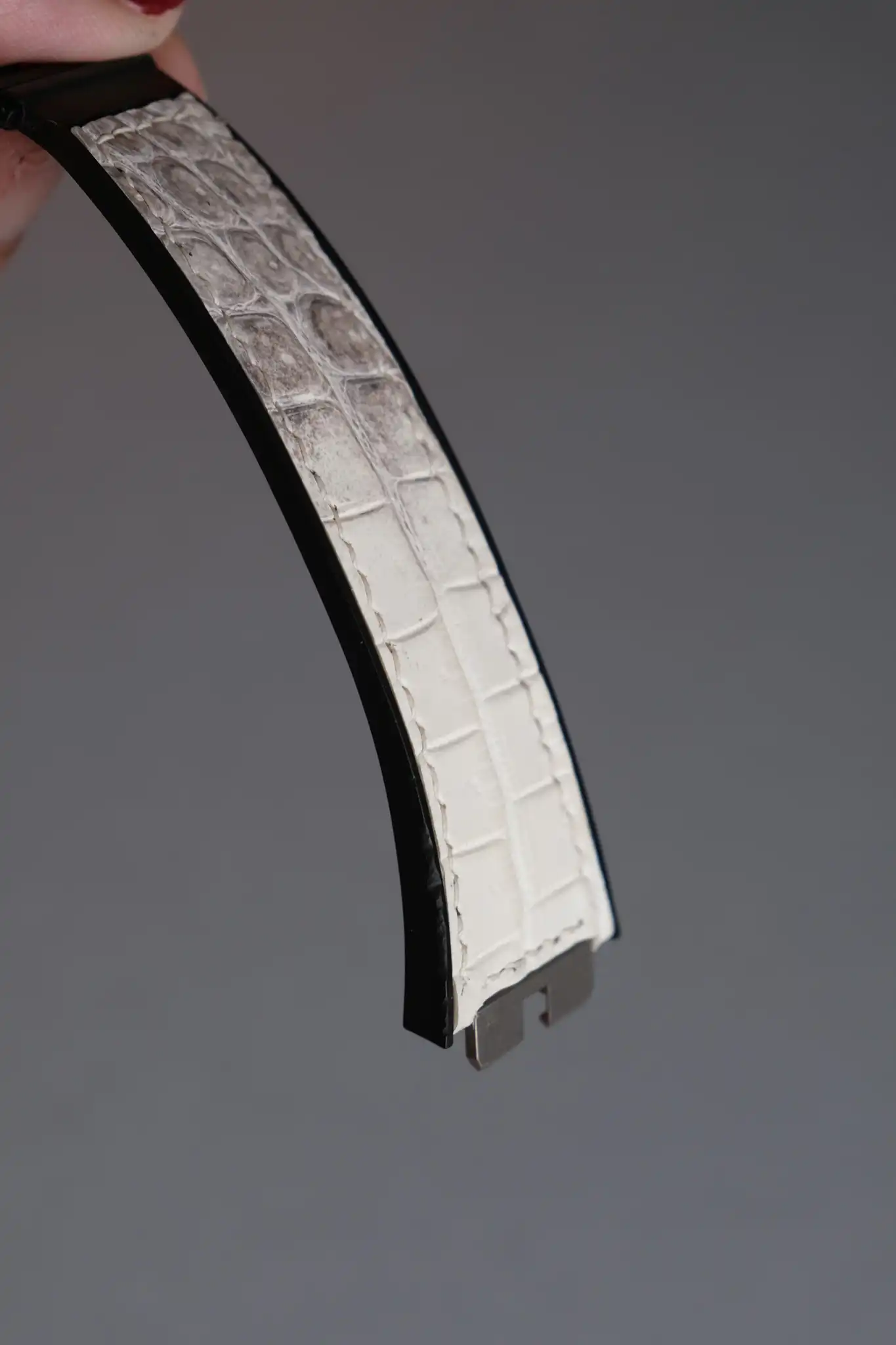 Hublot Straps – Da Alligator – White Ivory là lựa chọn hoàn hảo dành cho những ai muốn nâng tầm chiếc đồng hồ Hublot bằng một phụ kiện mang giá trị thủ công và thẩm mỹ cao cấp. Được chế tác từ da cá sấu thật, dây sở hữu sắc White Ivory (trắng ngà) tinh tế, pha ánh xám tự nhiên, tạo cảm giác sang trọng, sạch sẽ và khác biệt ngay từ cái nhìn đầu tiên.